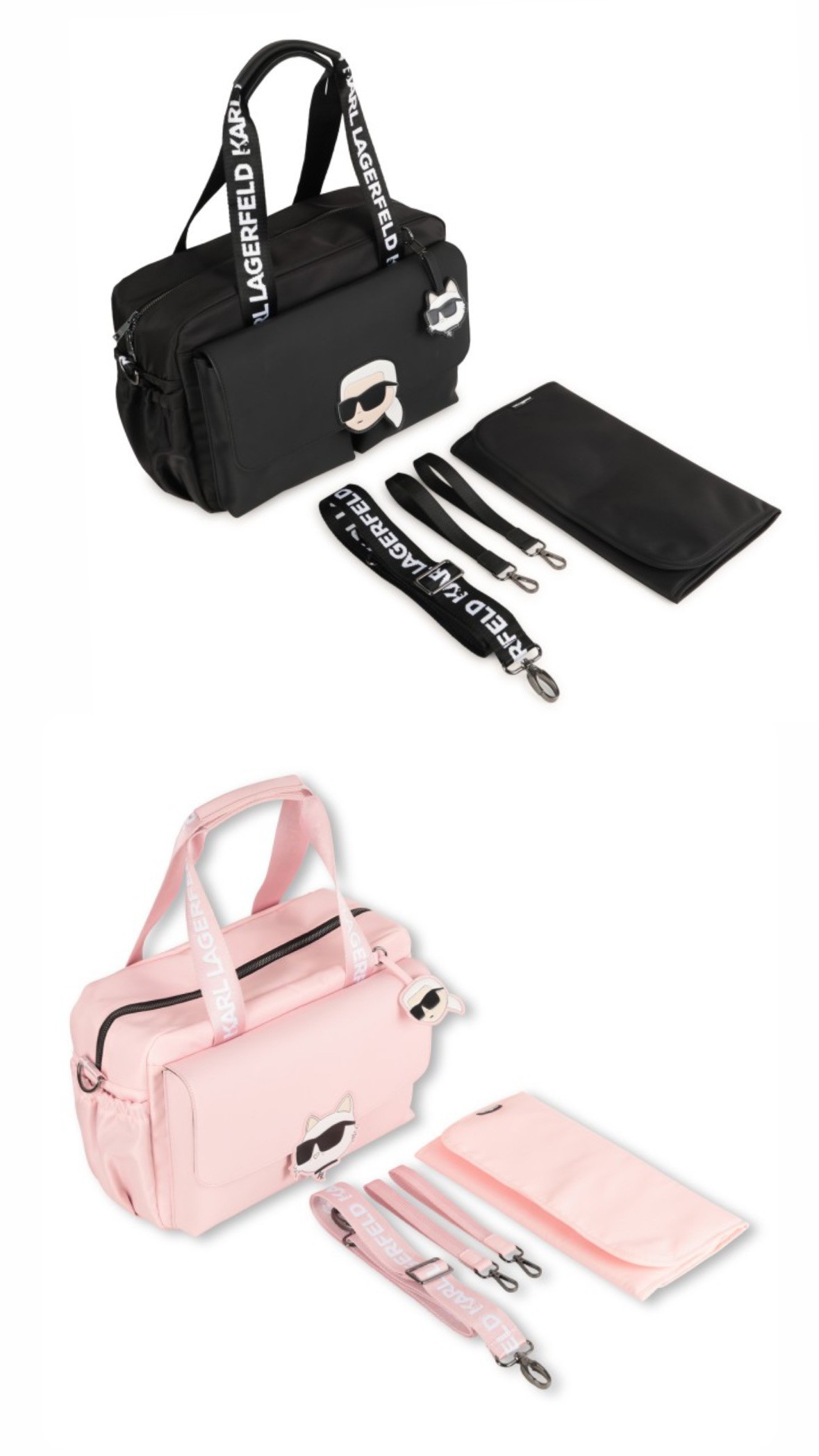 Textile enduit effet gomme (rabat + poches). Badges et porte-clés KARL ou CHOUPETTE. Matelas à langer + 2 attache-poussettes + Sangle amovible jacquard siglé. Grandes poches extérieures, fermeture par pression magnétique. Compartiments intérieurs avec poches en résille. Doublure griffée. Fermeture zippée. Base renforcée avec rivets. Plaque métal au dos.