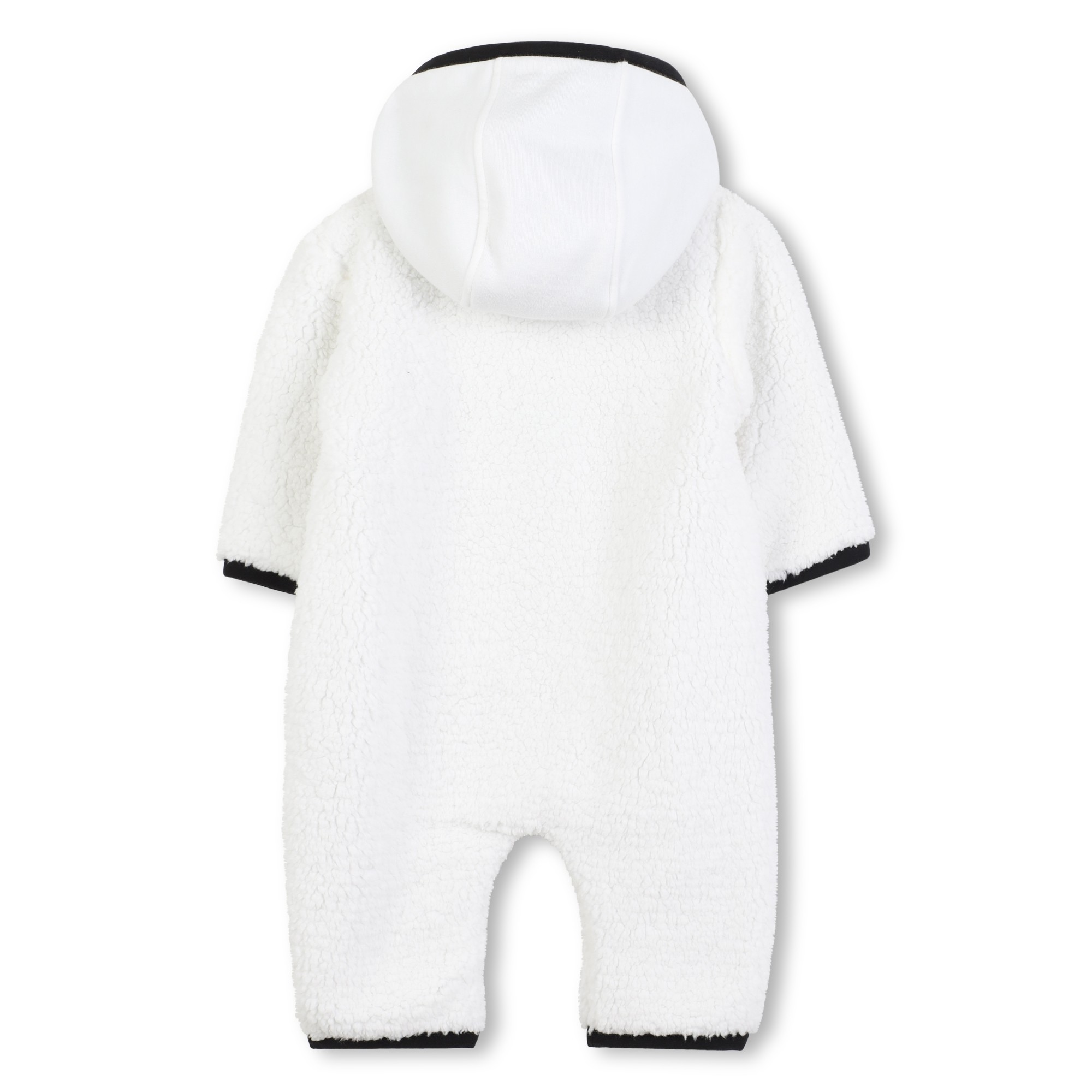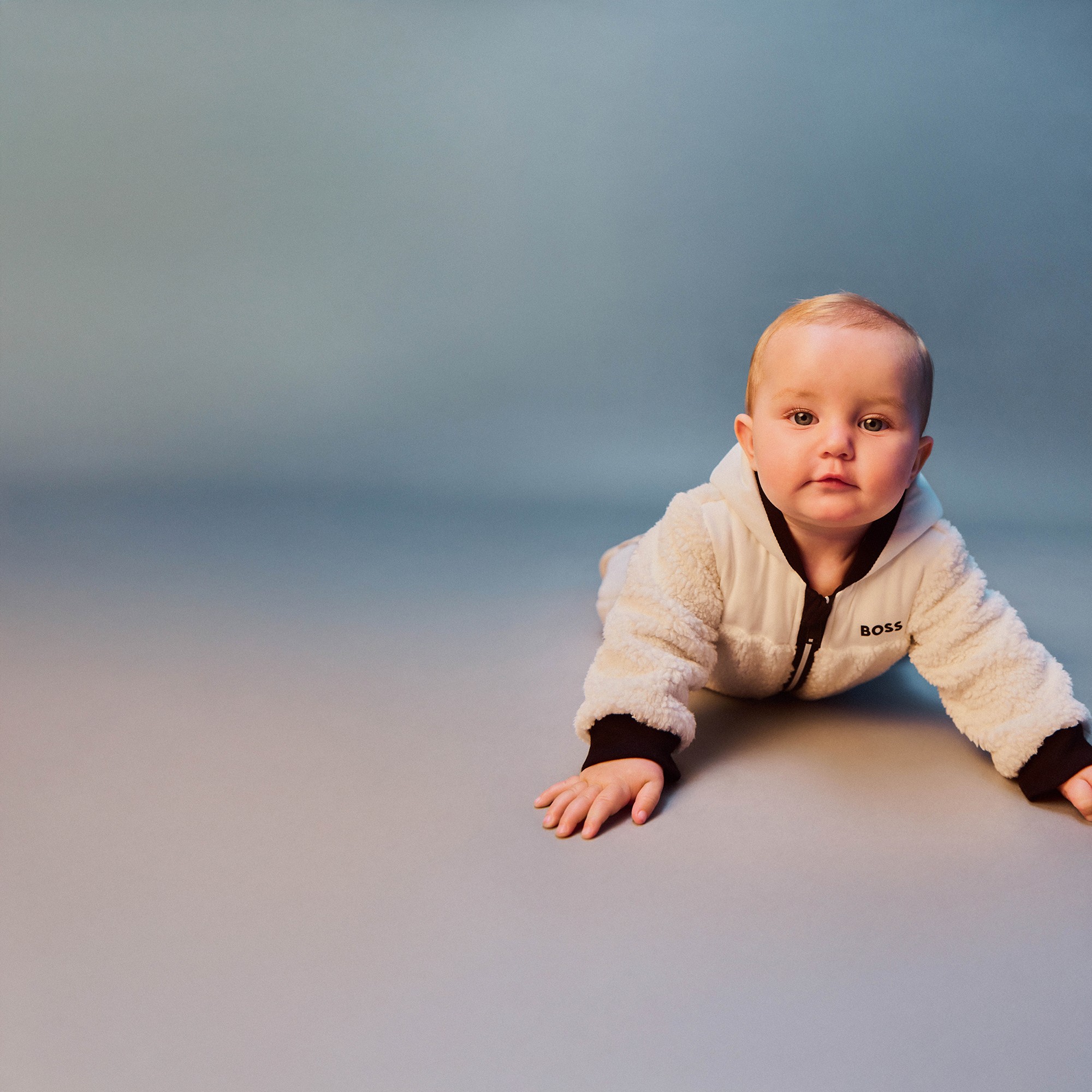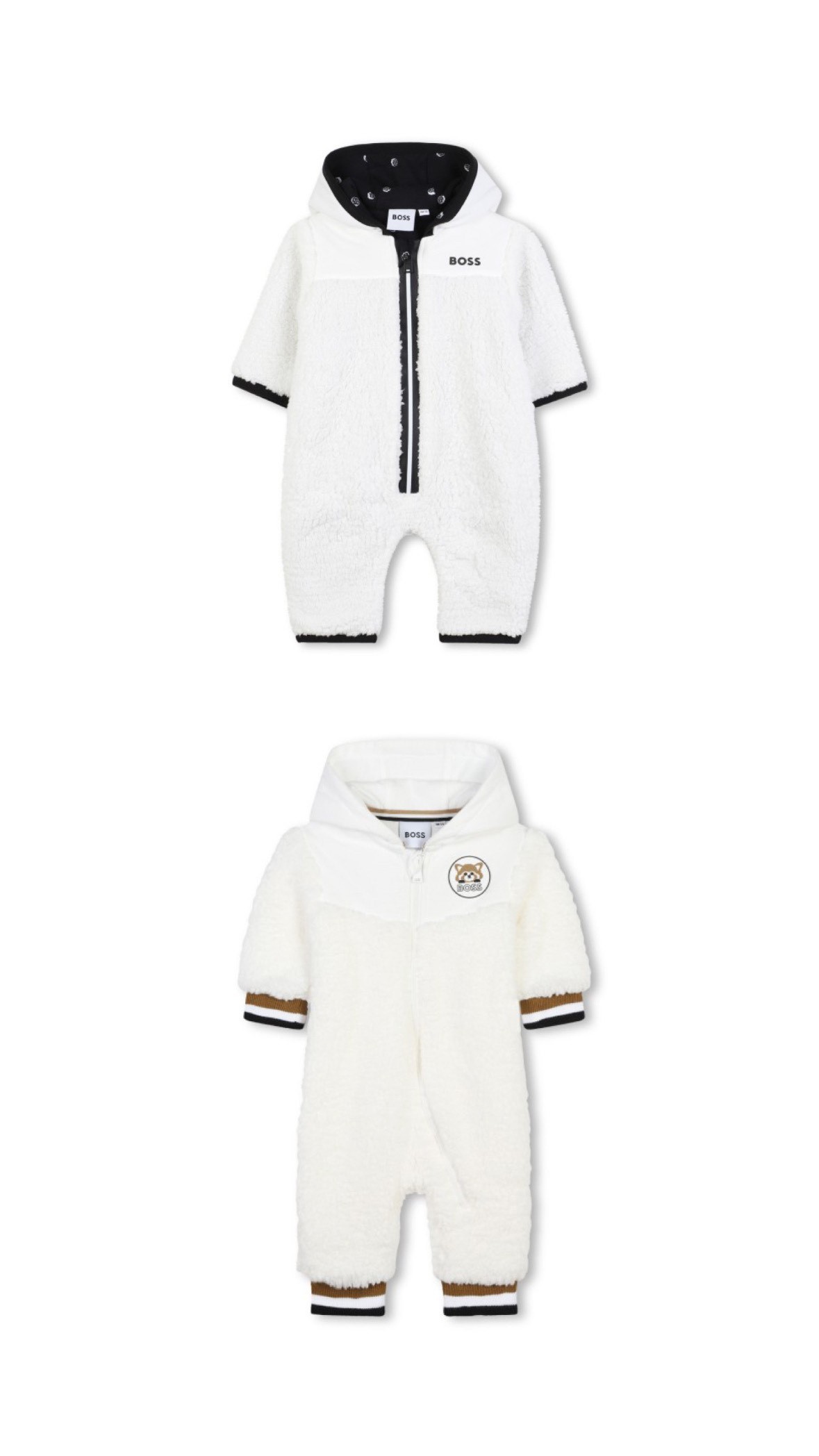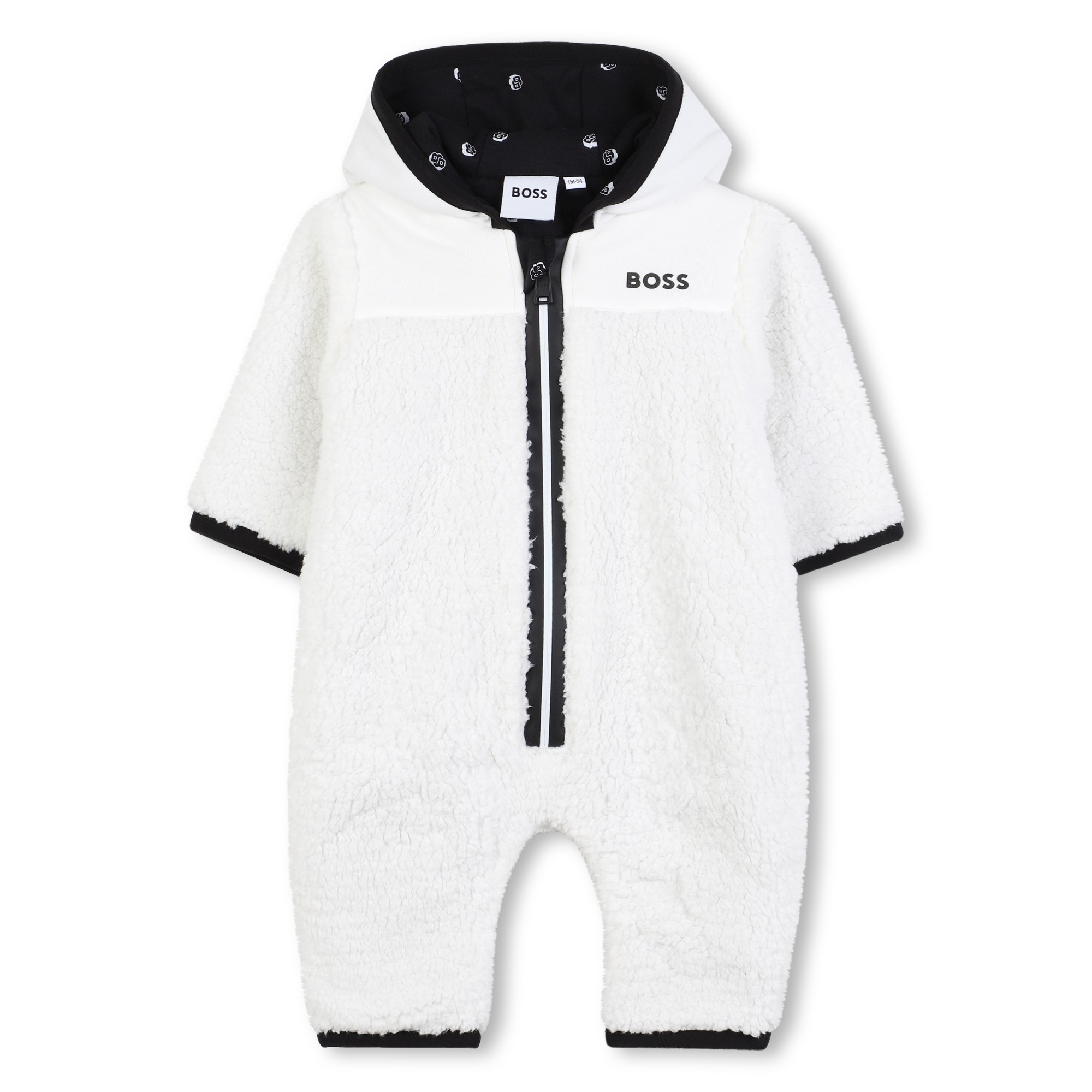 Combinaison en sherpa blanc et intérieur bleu marine : Cette combinaison BOSS pour bébé marie douceur et protection grâce à son mix de tissu peluche et de coton. Son zip contrasté à l'avant, résistant à l'eau, est aussi pratique que design. Le logo BOSS imprimé sur la poitrine et la doublure à imprimé intégral viennent sublimer cette pièce confortable et stylée.