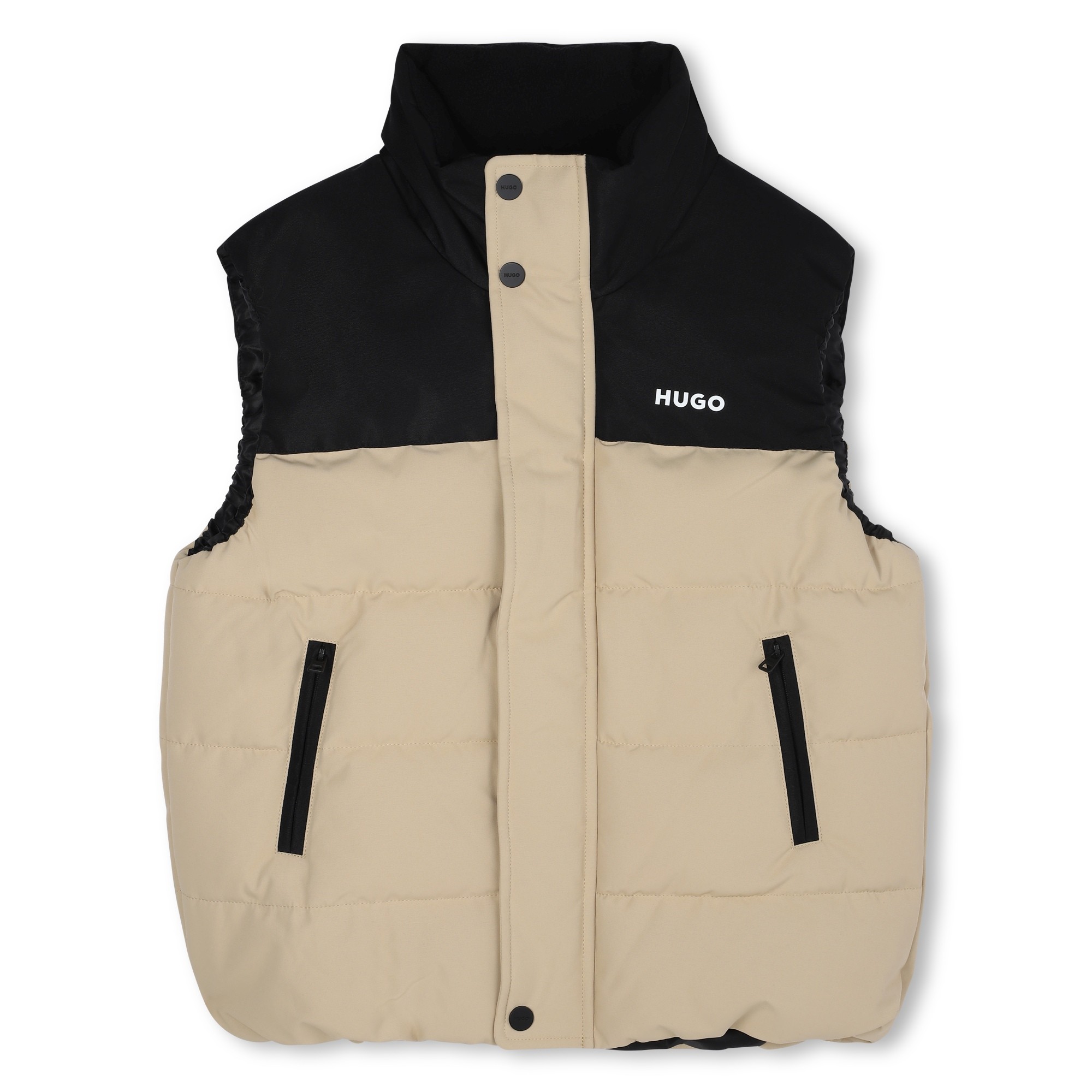 Alliant confort et style, cette doudoune sans manches de la marque HUGO est fabriquée en polyester pour une chaleur légère. Avec ses poches passepoilées sur les côtés et son logo 'HUGO' imprimé en relief sur la poitrine, elle offre un look moderne et pratique, parfait pour un style décontracté mais soigné.
