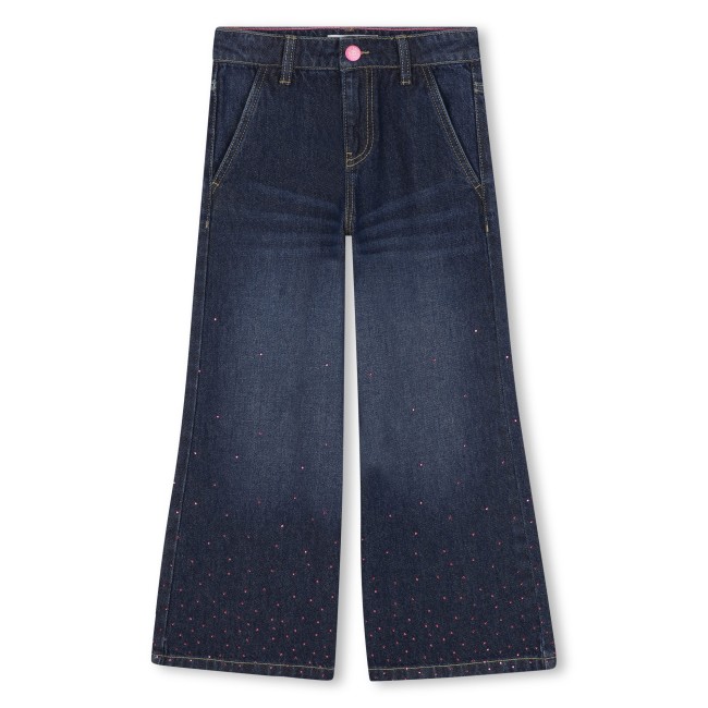 PANTALON EN DENIM BLEU : Ce pantalon en denim BILLIEBLUSH, à la coupe large et à la taille ajustable, combine confort et style avec une touche de brillance. Les strass dégradés dans le bas du pantalon ajoutent une note scintillante et moderne, tandis que l'étiquette silicone brillante au dos apporte une finition soignée. La fermeture braguette garantit un ajustement parfait.