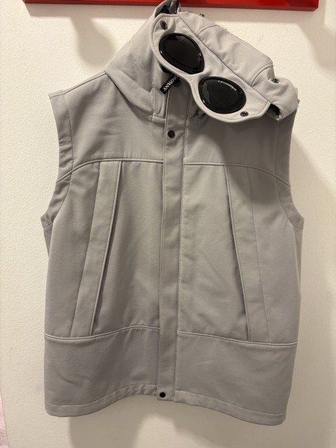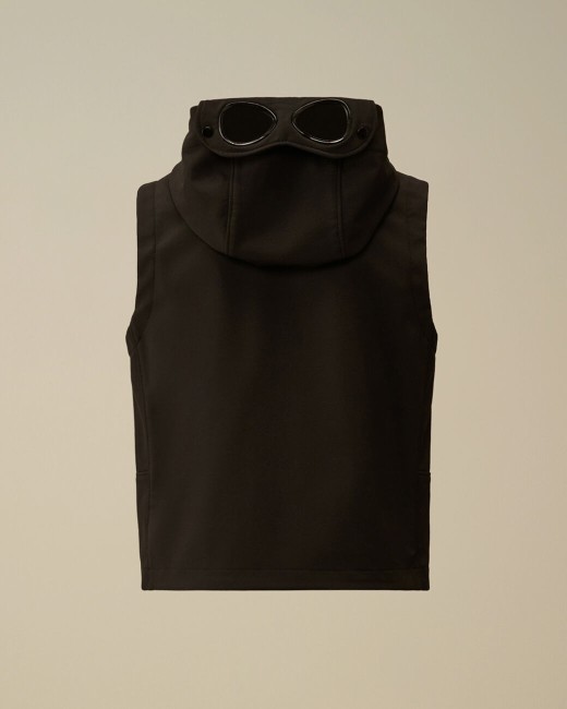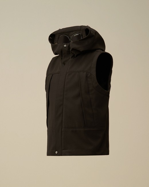 Gilet Goggle confectionné en C.P. Shell-R, un softshell extensible 3 couches multifilament recyclé. Confectionné à partir de fil de polyester recyclé, certifié par le Global Recycled Standard (GRS). Le gilet comprend la capuche Goggle emblématique de C.P. Company, une fermeture à glissière intégrale cachée avec rabat à pression, et des poches latérales zippées. Coupe régulière.