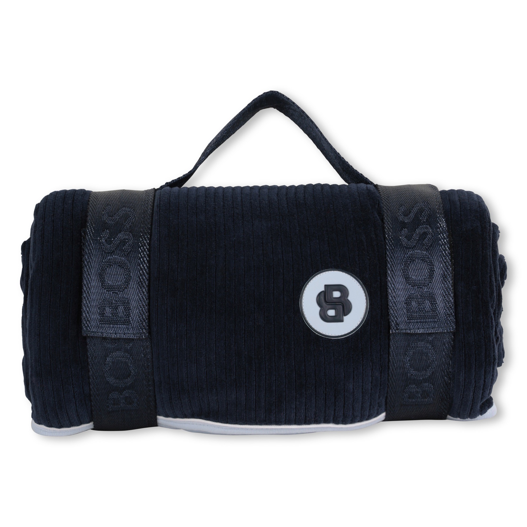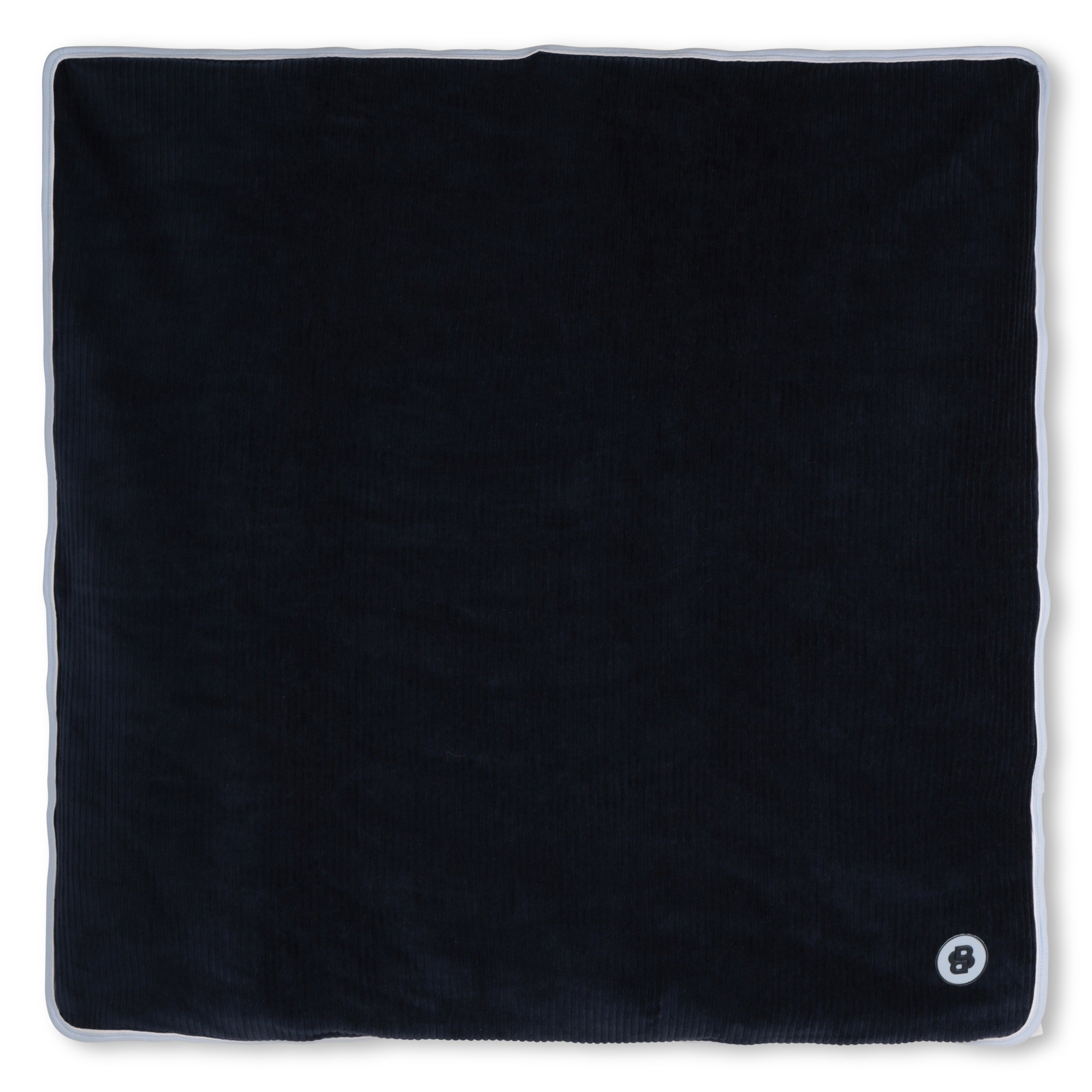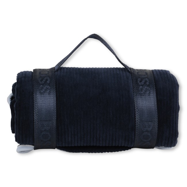 COUVERTURE BLEU MARINE : Cette couverture BOSS bi-face est l'alliance parfaite entre confort et style. D'un côté, contenant du coton issu de l'agriculture biologique doux et imprimé siglé, tandis que l'autre côté en velours côtelé ajoute une texture luxueuse. Le badge gomme siglé Double B et la sangle jacquard avec fermeture auto-agrippante assurent à la fois élégance et praticité.