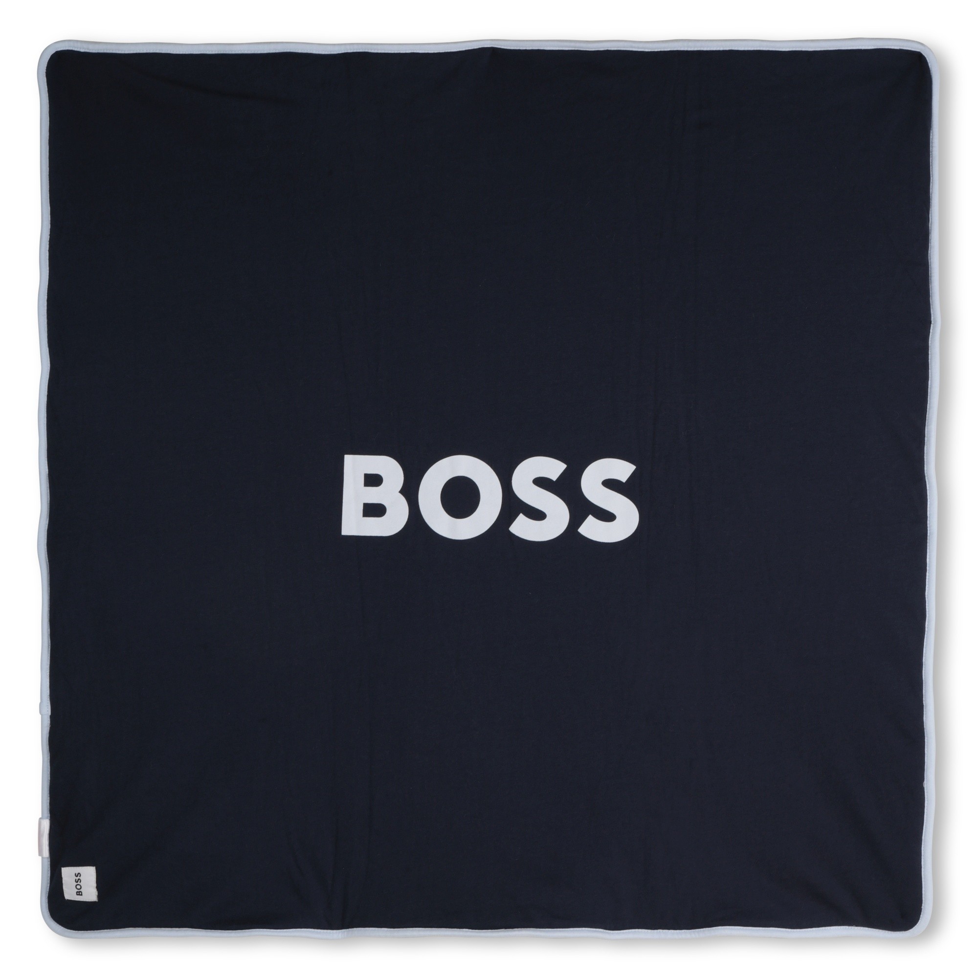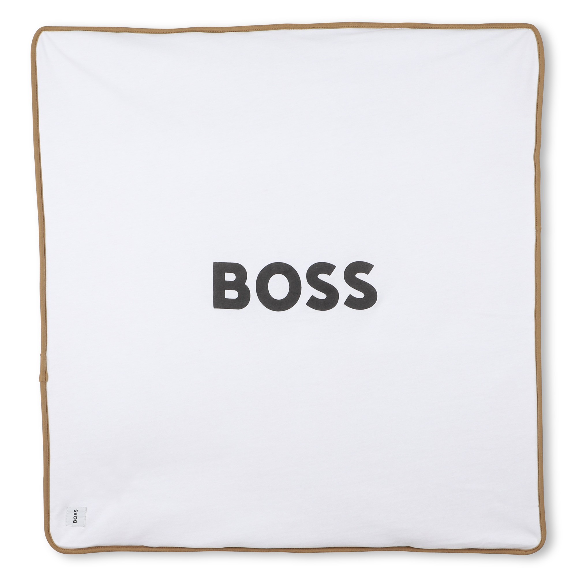 COUVERTURE COOKIE/BLANC : Cette couverture bi-face signée BOSS allie douceur et élégance. Une face en velours ultra moelleux avec broderie siglée, l'autre contenant du coton issu de l'agriculture biologique tout en souplesse. Parfaite pour envelopper bébé dans un cocon de confort avec une touche chic à chaque instant.
