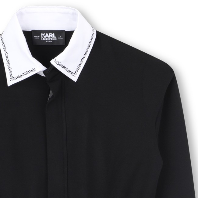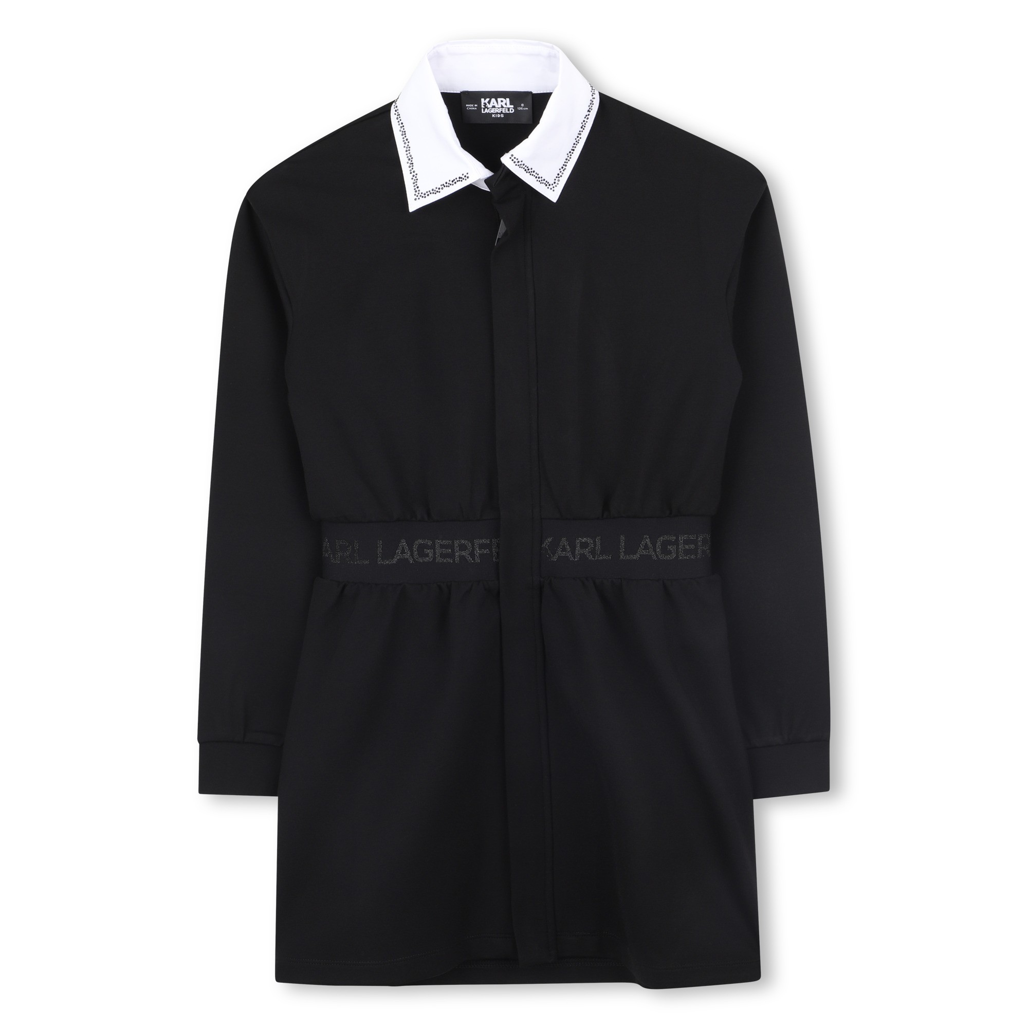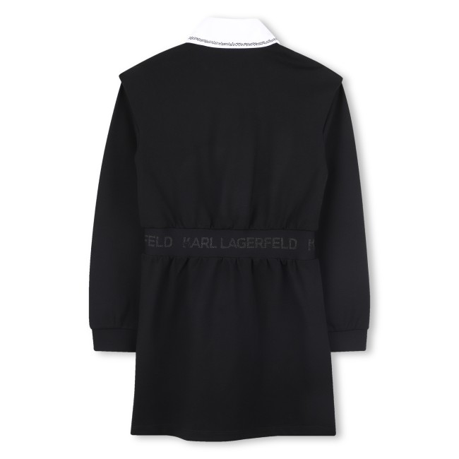 Cette robe manches longues se distingue par son col en popeline au coloris contrasté, subtilement agrémenté de strass pour une touche d'éclat. L'ouverture zippée sur le devant et l'élastique à la taille, orné d'un jacquard siglé KARL LAGERFELD KIDS, assurent un ajustement parfait et un style à la fois élégant et moderne.