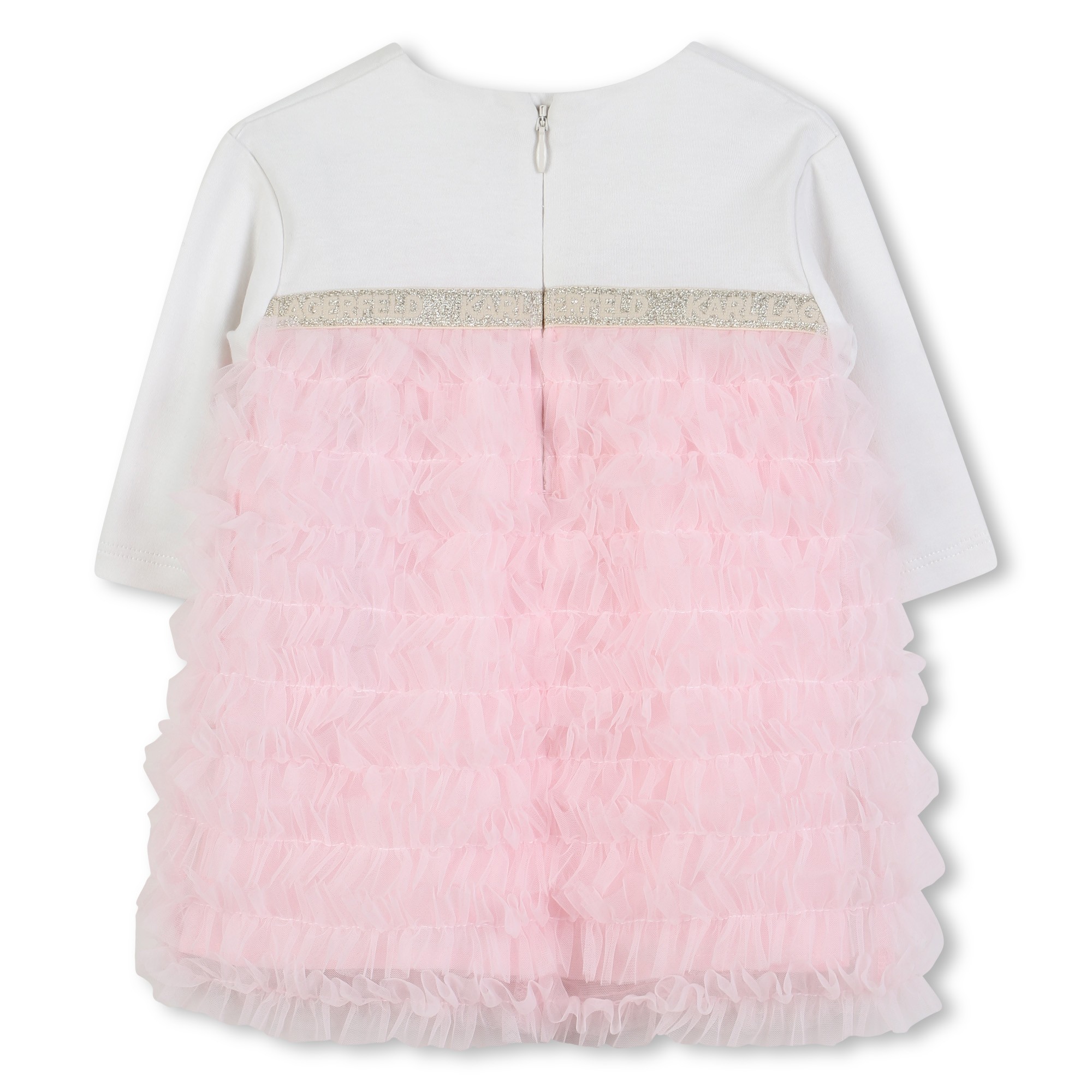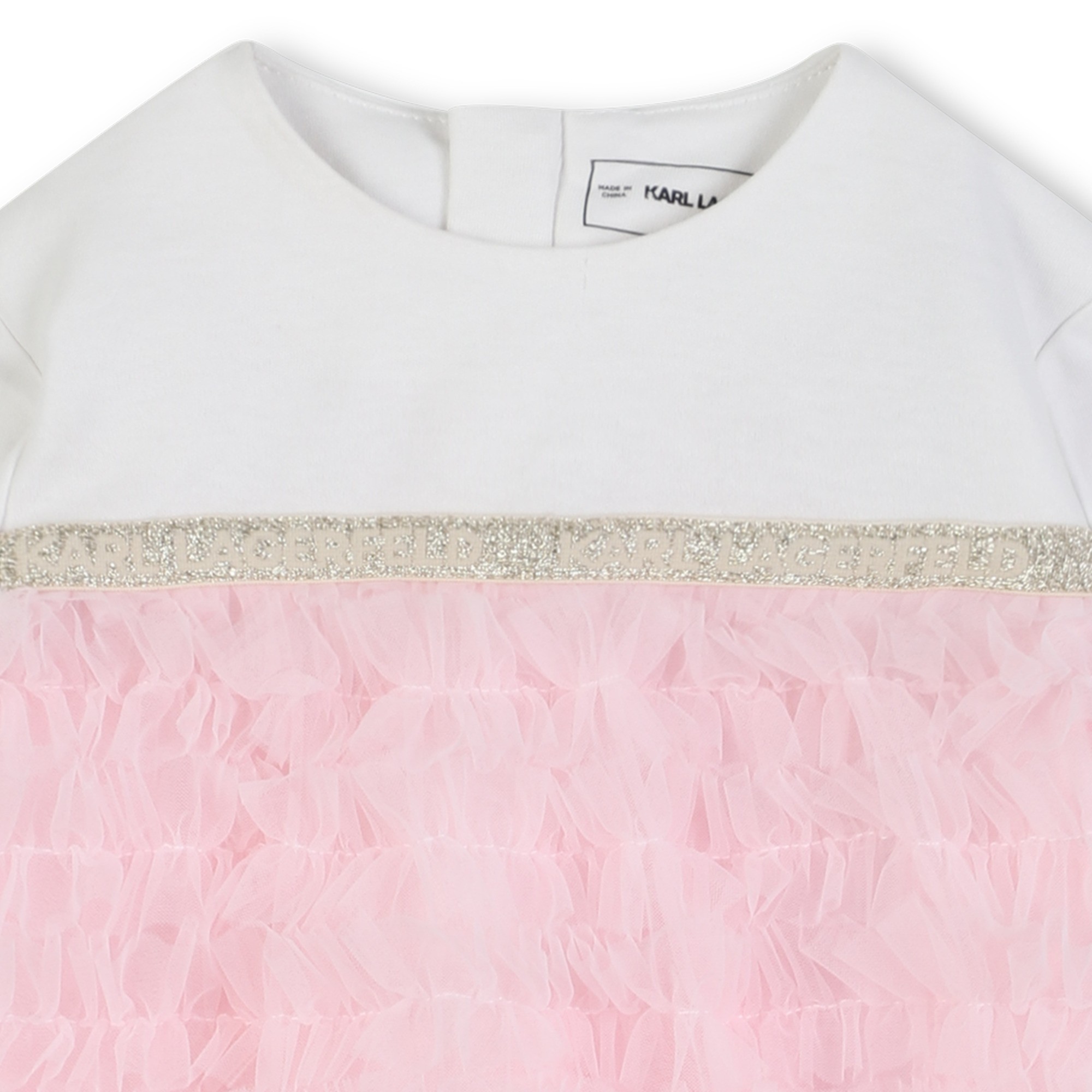 Élégante et pleine de finesse, cette robe séduit par son haut à manches délicates, contrastant avec une jupe en maille ajourée subtilement doublée. Une ceinture élastique dorée siglée KARL LAGERFELD KIDS vient souligner la silhouette avec éclat. Grâce à sa fermeture zippée au dos, l'habillage reste facile. Une pièce idéale pour briller lors des grandes occasions.