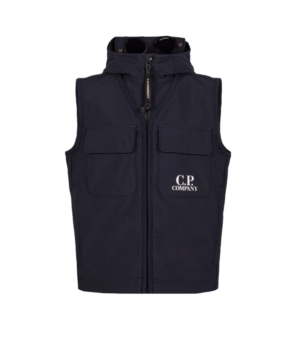 Cette veste sans manches noire possède une capuche intégrée avec lunettes et une fermeture éclair centrale intégrale. Confectionné en tissu softshell stretch en nylon recyclé, il est doté de poches poitrine à rabat et de poches latérales zippées. Le logo est imprimé en blanc sur le devant.